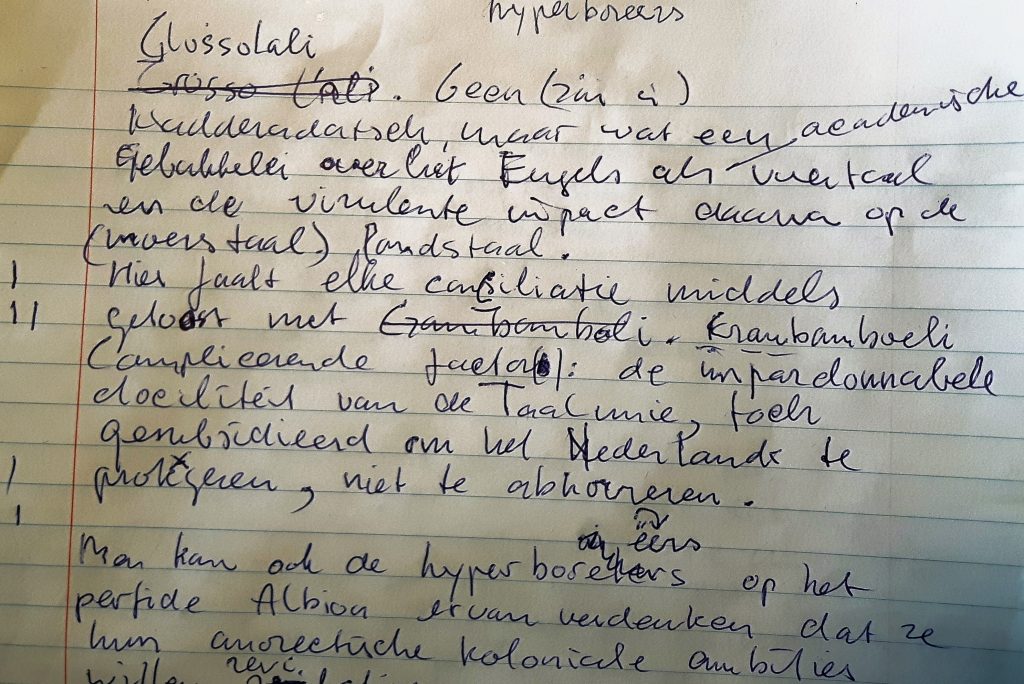 U begrijpt wel, op dit punt ben ik keihard voor mijzelf. Ik tel 16 fouten in totaal, ook de allerkleinste meegerekend. Dat is dus twee minder dan het gemiddelde in de zaal. Nou ja, als ik echt heel eerlijk ben, ik geef dit niet graag toe, heb ik de titel toch een beetje bij elkaar gespiekt. Kon ik niets aan doen, gebeurde gewoon. De tv-camera zoomde af en toe in op de in wording zijnde schrijfsels van de deelnemers in de Ridderzaal, zodat je als kijker thuis toch even kon vergelijken. Tsja en toen zag ik ook ineens het licht: Glossolalie! Natuurlijk wie kent het nie?